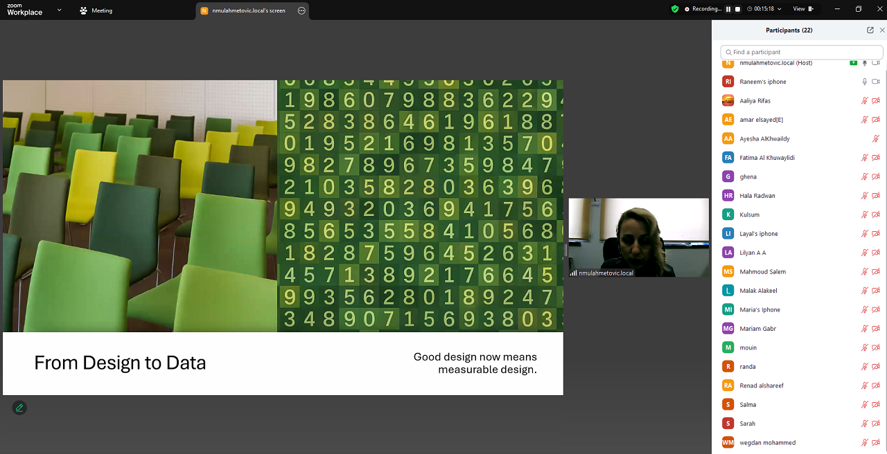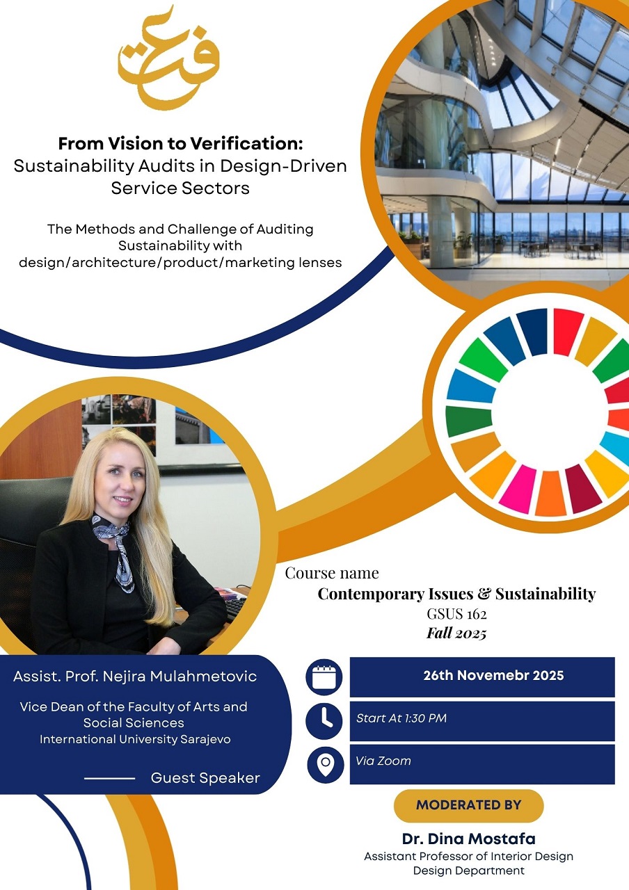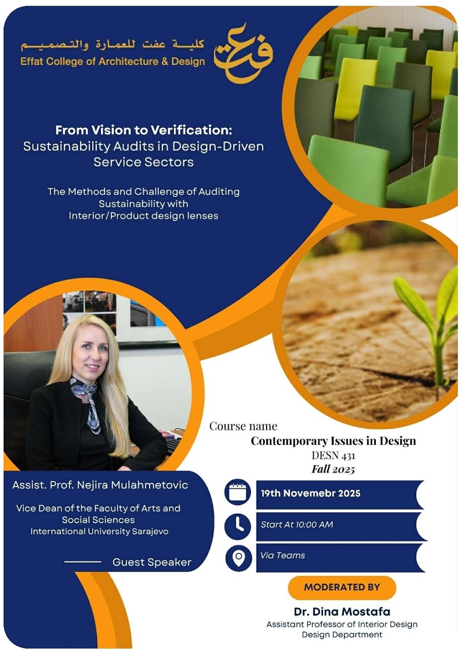 26 Kasım 2025 Çarşamba günü, Sanat ve Sosyal Bilimler Fakültesi (FASS) Dekan Yardımcısı ve Görsel Sanatlar ve Görsel İletişim Tasarımı (VACD) programı öğretim üyesi Öğretim Görevlisi Nejira Mulahmetović, MA, Suudi Arabistan’ın Cidde kentindeki Effat Üniversitesi – Mimarlık ve Tasarım Fakültesi’nde konuk konuşmacı olarak yer aldı.