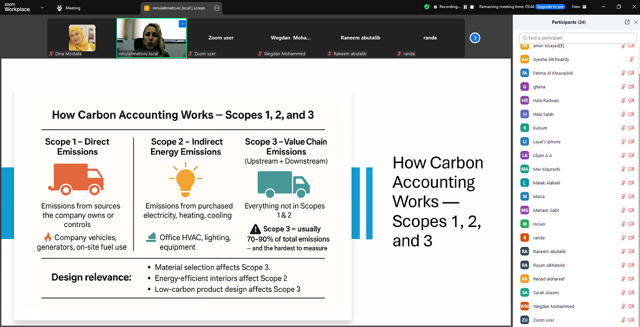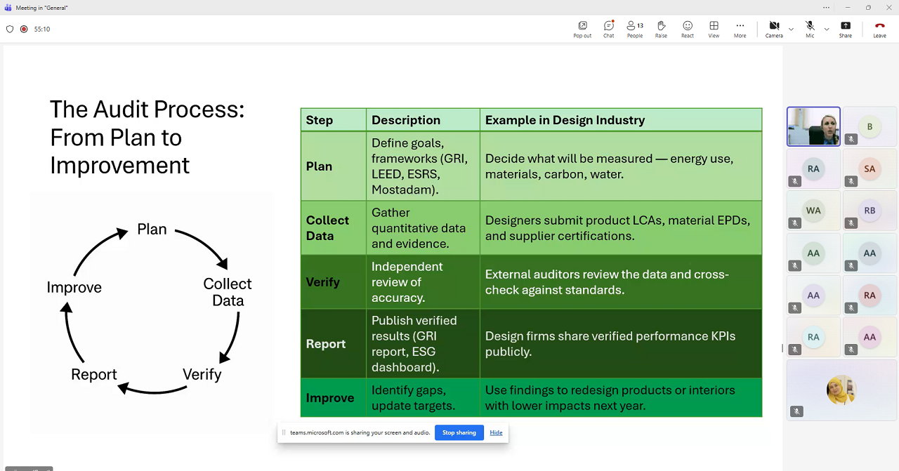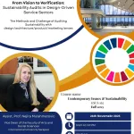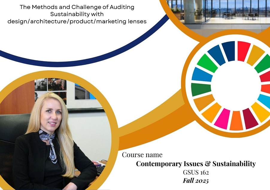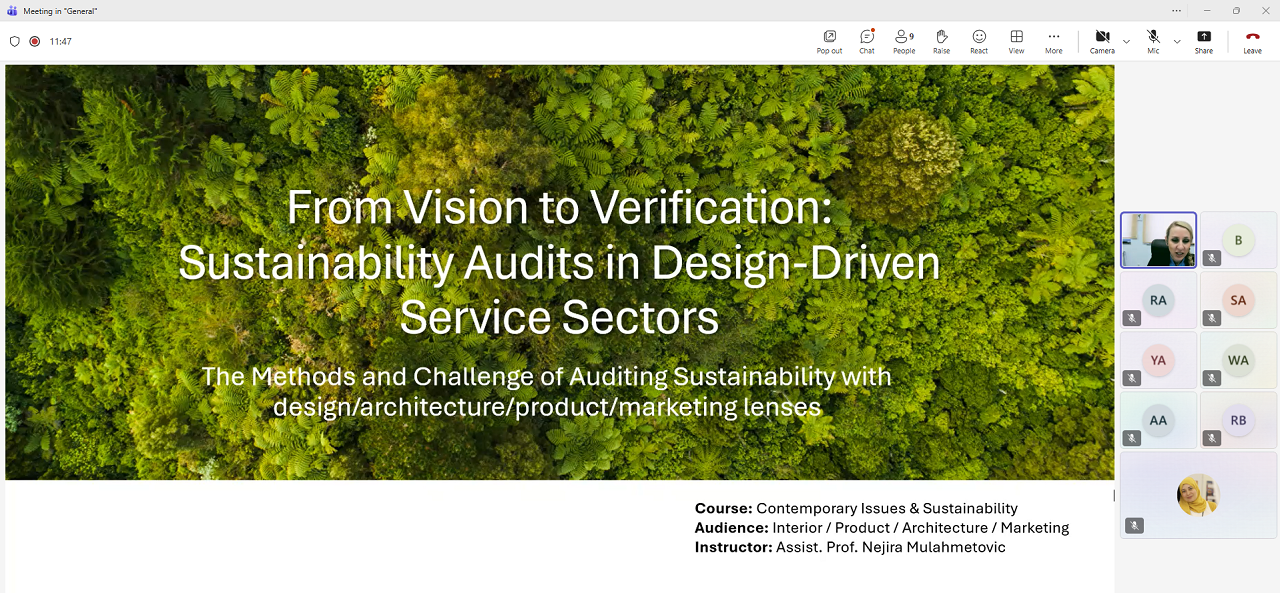 Çağdaş Konular ve Sürdürülebilirlik (GSUS 162) ile Tasarımda Çağdaş Konular (DESN 431) dersleri kapsamında, “Vizyon’dan Doğrulamaya: Tasarım Odaklı Hizmet Sektörlerinde Sürdürülebilirlik Denetimleri” başlıklı sunumlarını gerçekleştirdi. Bu kapsamda sürdürülebilirliğin mimarlık, tasarım, ürün geliştirme, iç mekân tasarımı ve pazarlama alanlarında nasıl ölçülebileceğini, doğrulanabileceğini ve iletişiminin sağlanabileceğini anlatarak öğrencilere küresel sürdürülebilirlik çerçeveleri, denetim zorlukları, karbon muhasebesi, kültürel bağlam ve tasarım etiği gibi konularda kapsamlı bir perspektif sundu.